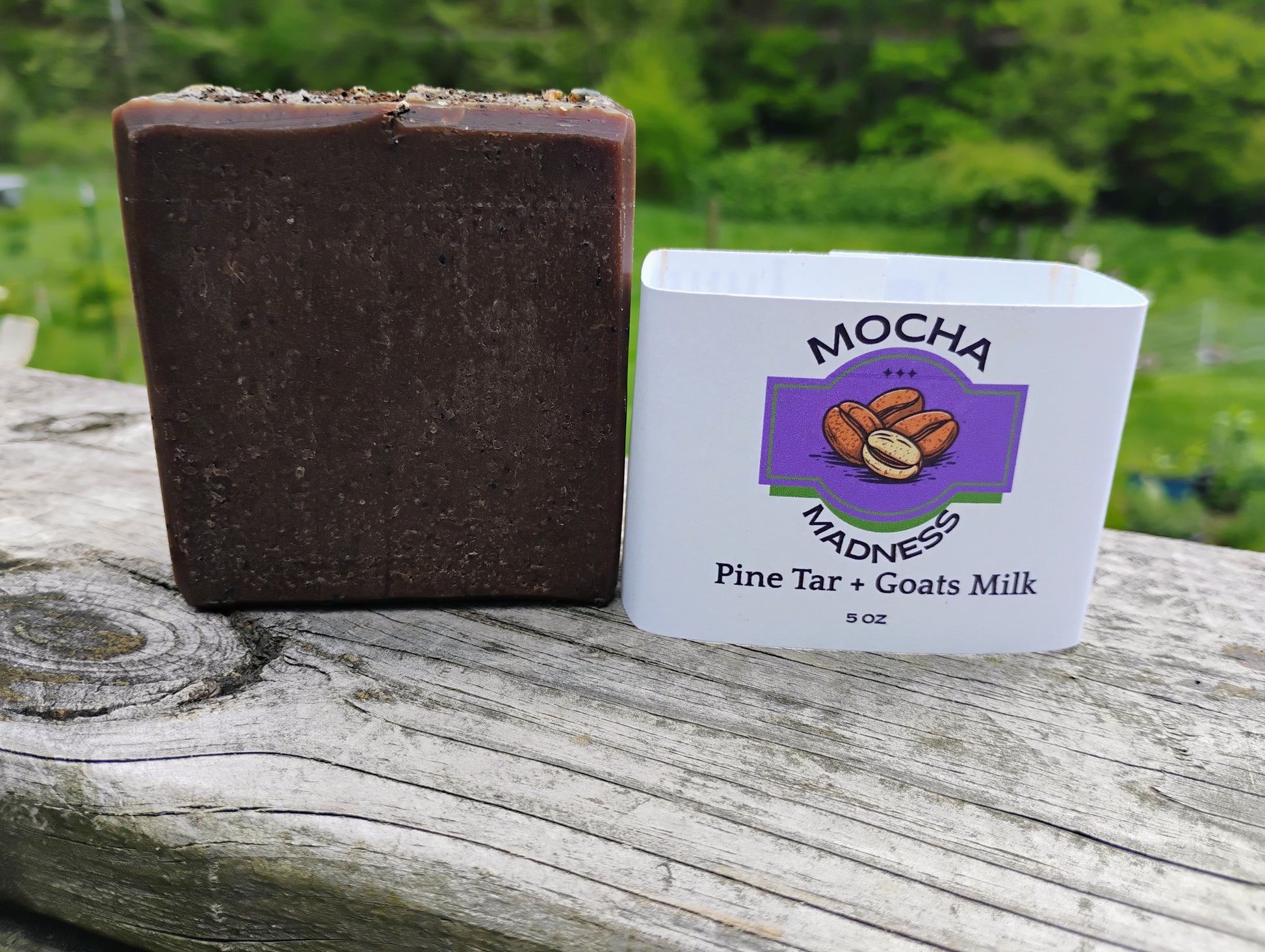 This is a Hand-Crafted, small-batch soap made with goats milk and coffee with coffee essential oil and vanilla oleoresin. My soaps are only made with the best oils and butters such as infused olive oil, organic coconut oil, Shea butter, cocoa butter, mango butter, etc. This soap also has pine tar in it for fantastic moisturizing properties. coffee granules have been added to the batter so it is mildly exfoliating. The name Mocha Madness comes from the surprising fragrance of cocoa in it as I added 1 tsp of cocoa powder to 4 lbs of batter....and all you smell is chocolate with a hint of coffee. And yes, I do use lye (sodium hydroxide) as you can't have soap without it. The lye is what transforms the batter into a soap..once saponified there is no lye so it does not cause a harsh bar.